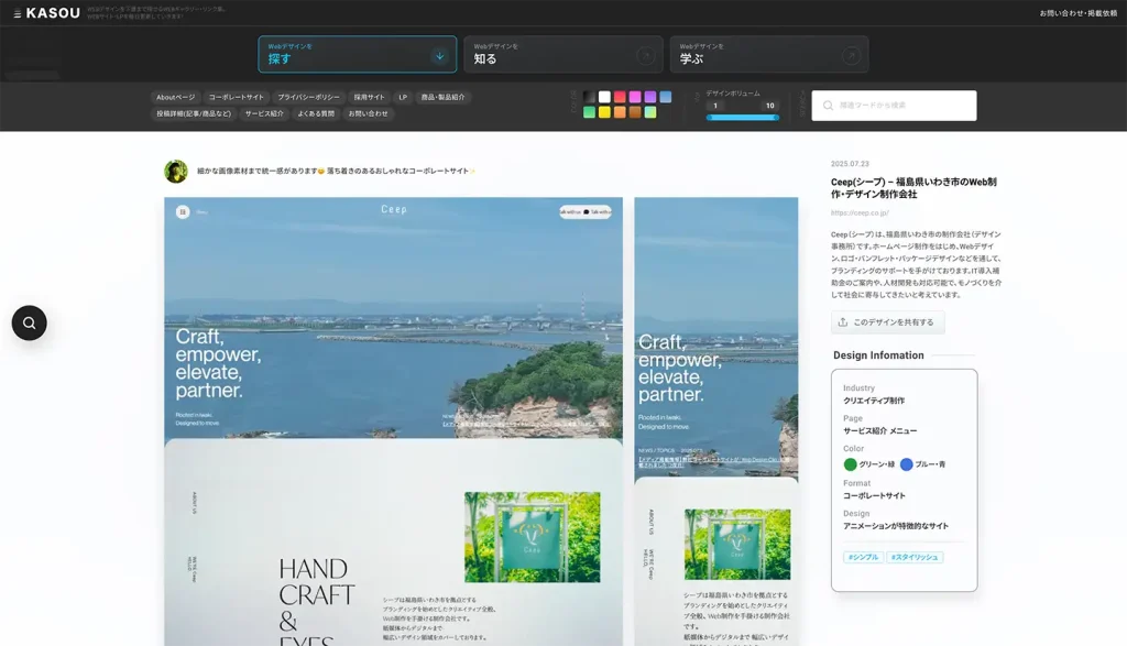 KASOU自体もシンプルながらも洗練されたUIで勉強になりますので、Webデザインに興味のある方はぜひご覧ください。